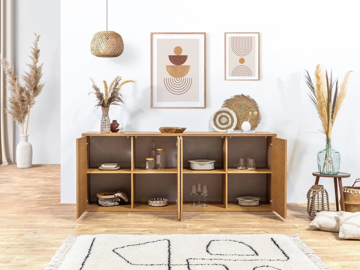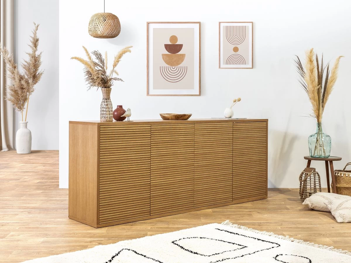 En quête d’un meuble capable de complètement transformer votre séjour, aussi bien dans la déco que dans son fonctionnement ? N’ayez crainte, voici le buffet 4 portes FERRET. En premier lieu, le buffet est un formidable objet déco. Entre son coloris chêne, sa finition laquée et sa façade en tasseaux de bois, ce meuble a tout ce qu’il faut pour s’imposer dans votre intérieur et illuminer votre déco. Cependant, c’est bien au quotidien qu’il saura se montrer indispensable. En effet, avec ses quatre portes et ses huit étagères larges et spacieuses, ce buffet vous offrira tout l’espace dont vous avez besoin pour organiser votre pièce !