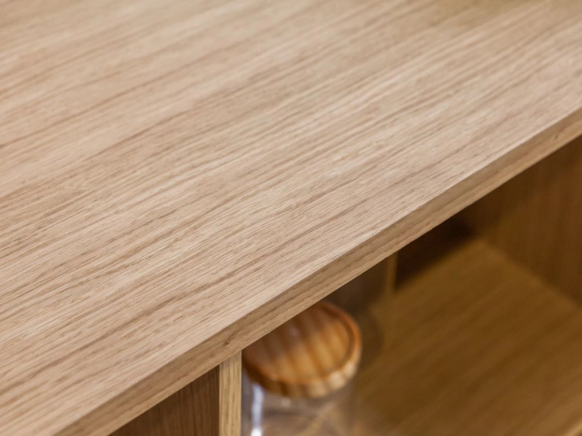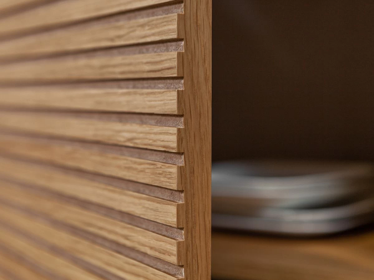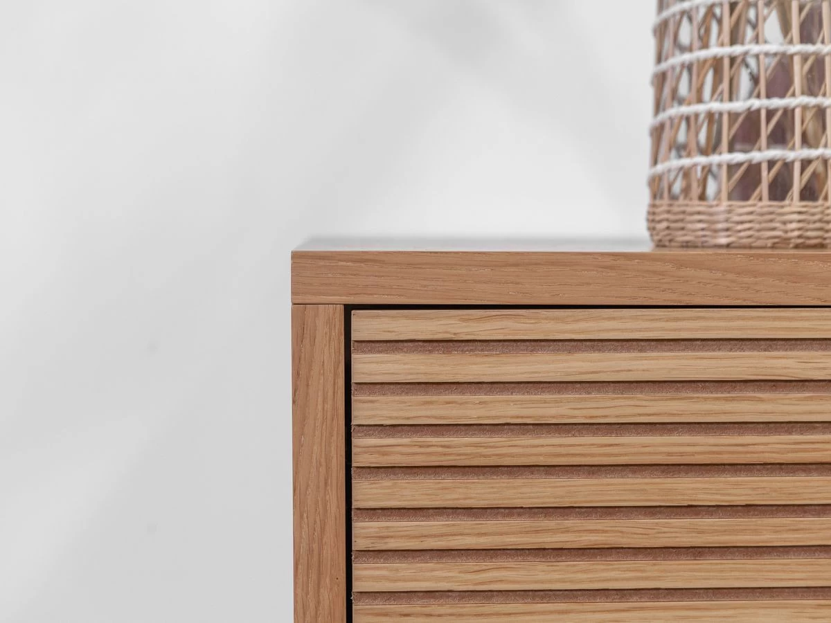 La principale force de la collection FERRET, c’est bien son visuel unique. D’une part, avec sa structure en plaqué chêne, elle saura trouver sa place dans votre intérieur et vous accompagnera pour de nombreuses années. D’autre part, elle saura se distinguer dans votre décoration d’intérieur, notamment via son coloris très chaleureux et sa finition laquée qui donneront cette aura de douceur et de lumière qui manque à votre pièce ! Dernier détail mais qui fera toute la différence : sa façade, composée de tasseaux de bois, lui confère une élégance rare et un vrai caractère ! Aucun doute, la collection FERRET saura trouver sa place dans votre intérieur et ce, en sublimant votre décoration !