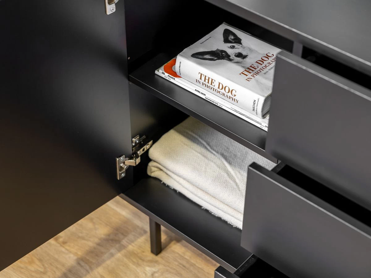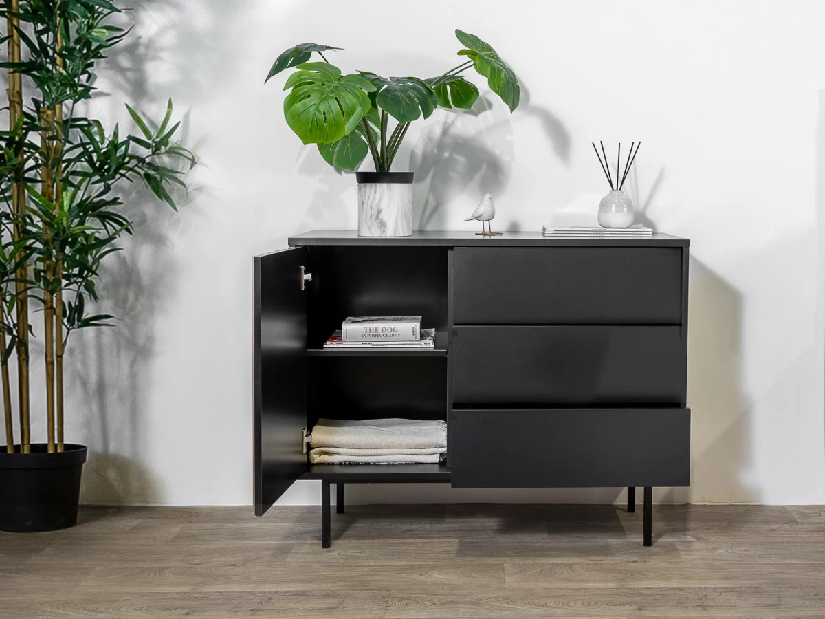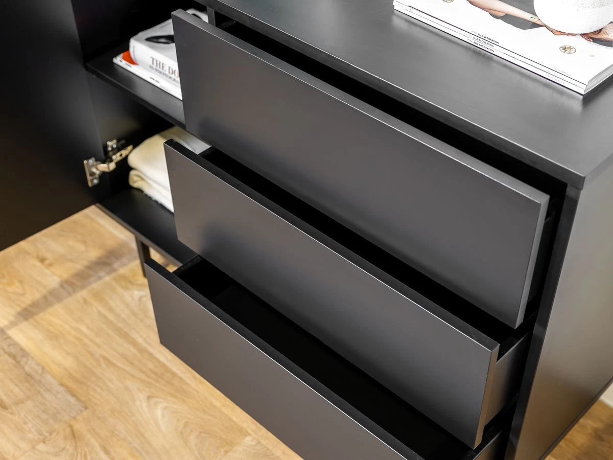 La commode CORNEILLE incarne l’alliance parfaite entre l’élégance et la rusticité. C’est une pièce à la fois fonctionnelle et esthétique qui apporte une touche de caractère à votre pièce à coucher. Sa couleur noire lui confère une certaine élégance et permet de l’intégrer dans différents styles d’intérieur. Les tasseaux de bois viennent ajouter une touche d’originalité. Ces éléments en bois finement travaillés ajoutent de la chaleur à l’ensemble.