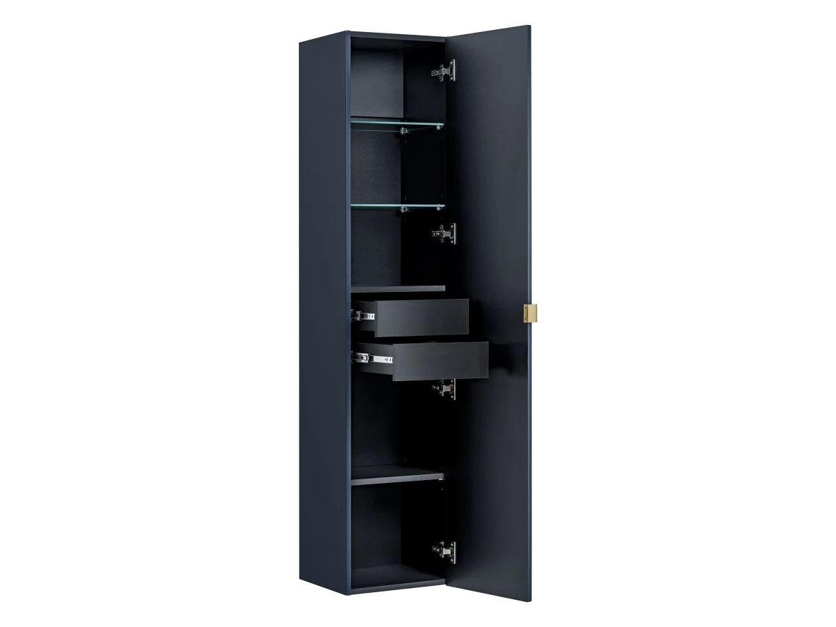 Ensemble de salle de bain composé d’un meuble de salle de bain de 120 cm à suspendre comportant 2 vasques à poser en céramique et 4 tiroirs dotés de bacs de rangement noirs (pratiques pour les produits d’hygiène et les cosmétiques) et d’une colonne de salle de bain 160 cm de hauteur comprenant une porte renfermant 2 tiroirs et 5 étagères.
