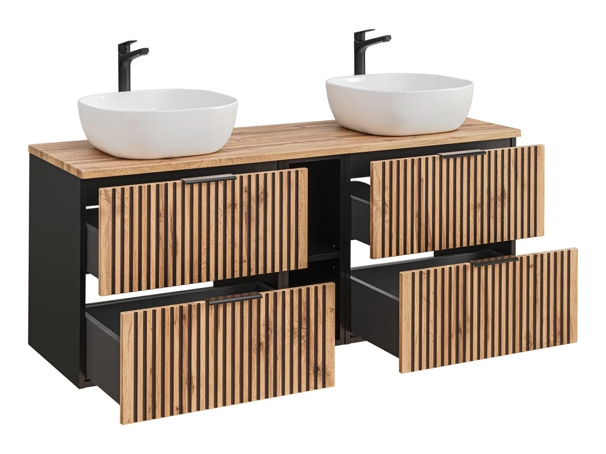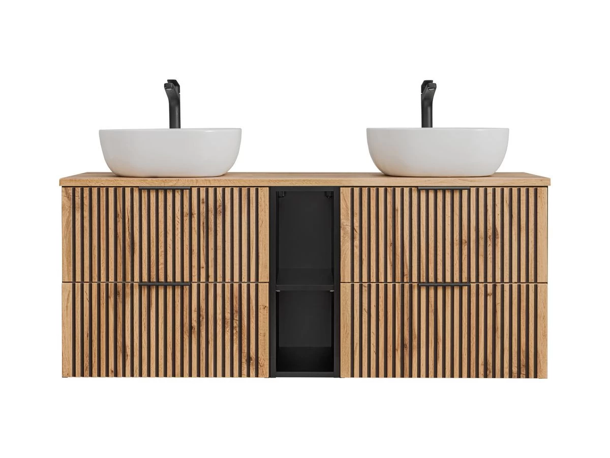 Meubles de salle de bain 140 cm à suspendre AXEL comportant 2 vasques à poser en céramique, un plan de travail effet chêne, 4 tiroirs couleur gris pierre à l’intérieur où vous pourrez y placer des bacs de rangements pour vos produits d’hygiènes et cosmétiques ainsi qu’une colonne de salle de bain 140 cm dotée de 3 étagères.