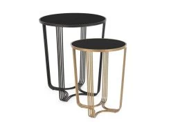 Découvrez le lot de 2 tables basses CECILIA à la structure en acier couleur or pour l’une, et couleur noire pour l’autre, ainsi que le plateau en verre !