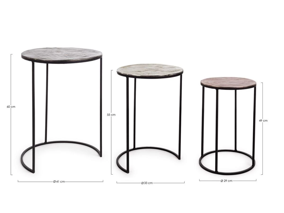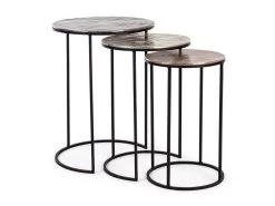Le lot de 3 tables basses gigognes en acier effet bronze HORTENSE est idéal pour un intérieur original grâce aux 3 plateaux de tables en aluminium avec finition plaquée et vieillie, de 3 couleurs différentes.