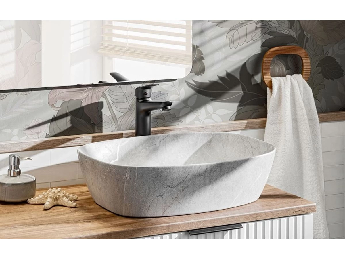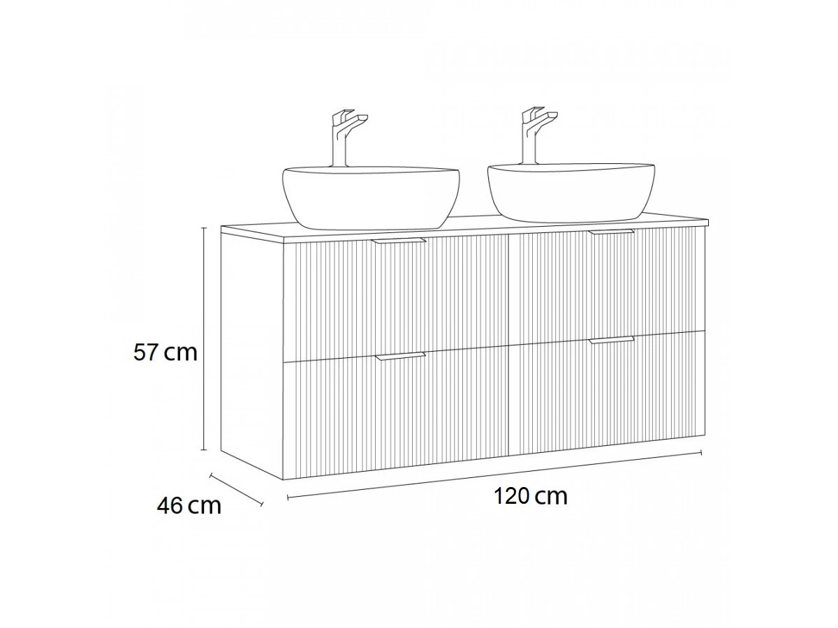 Le meuble de salle de bain 120 cm HILONA noir à suspendre comporte 2 vasques à poser en céramique avec un effet béton, un plan de travail, 4 tiroirs couleur gris pierre à l’intérieur où vous pourrez y placer des bacs de rangements pour vos produits d’hygiènes et cosmétiques. Ce meuble aux deux poignées couleur noirs rendra votre salle de bain unique et élégante.