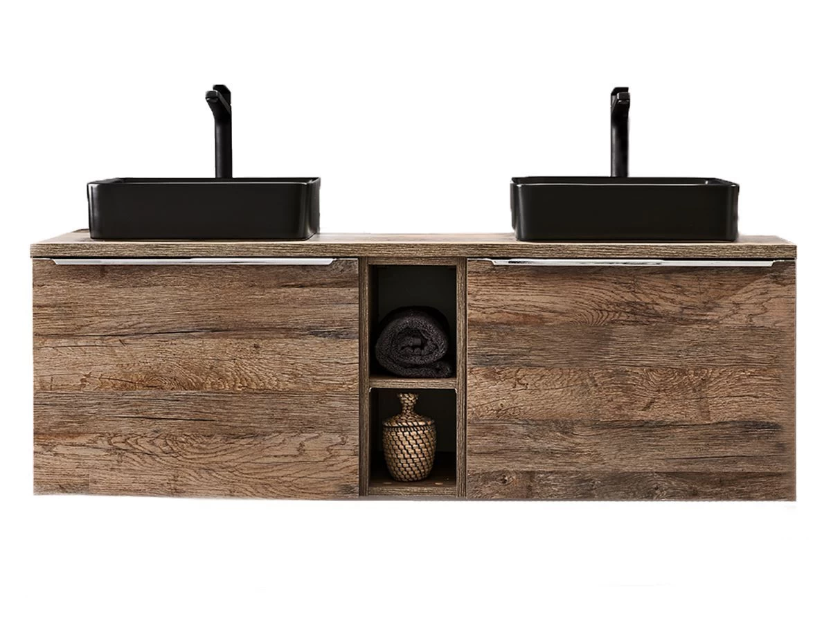 Meuble de salle de bain 140 cm à suspendre doté de 2 vasques noirs en céramique à poser, comprenant 4 tiroirs et une niche double centrale. Ses tiroirs comportent des bacs de rangement noirs pratiques pour les produits d’hygiène et les cosmétiques. Robinetterie non incluse. Plan vasque sans pré-perçage.
