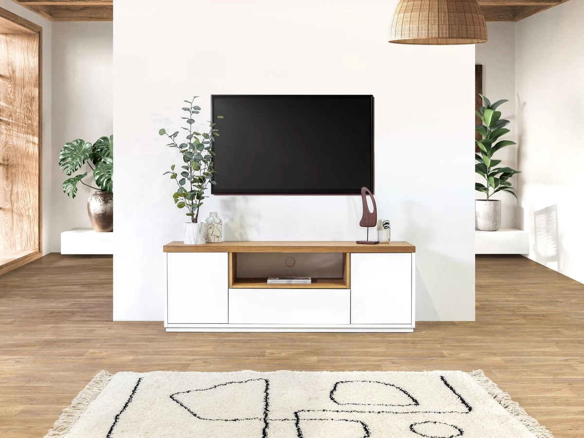Le meuble TV 160cm ABY a été pensé pour trouver sa place dans tous les intérieurs. En effet, grâce à ses dimensions plus compactes, ce dernier n’aura aucun mal à s’intégrer à n’importe quelle pièce ! Sans oublier qu’il apportera son design tendance, notamment sa superbe combinaison de blanc et de chêne, pour donner à votre espace une ambiance chaleureuse et lumineuse. Enfin, n’oublions pas que celui-ci saura vous rendre la vie plus simple et ce, grâce à ses deux portes et ses trois étagères, qui vous offriront un grand nombre de solutions de rangement !