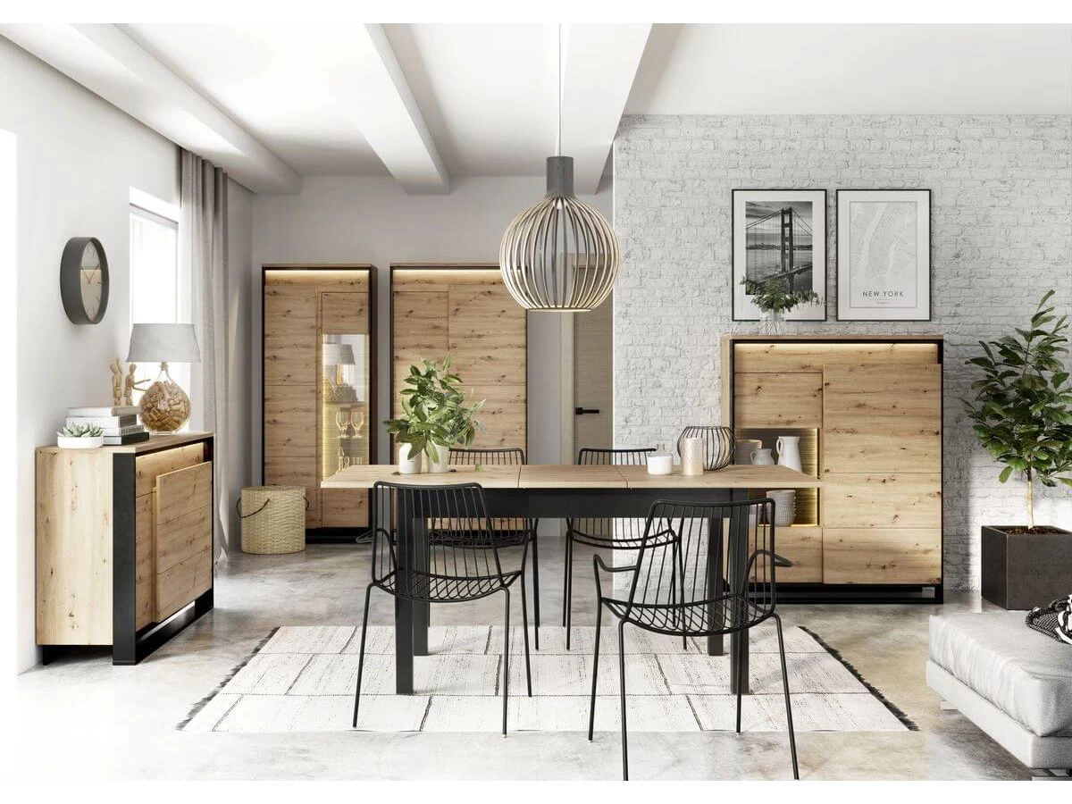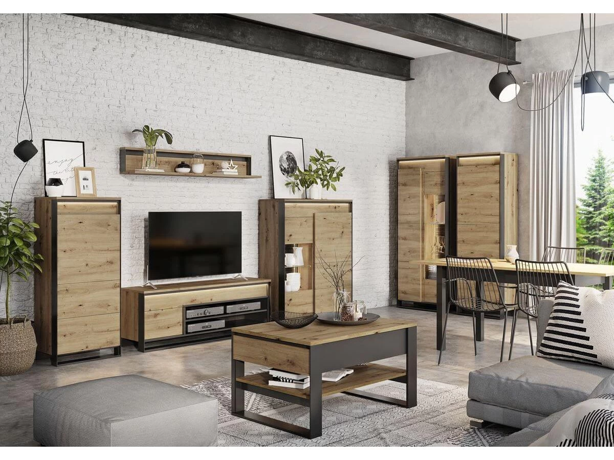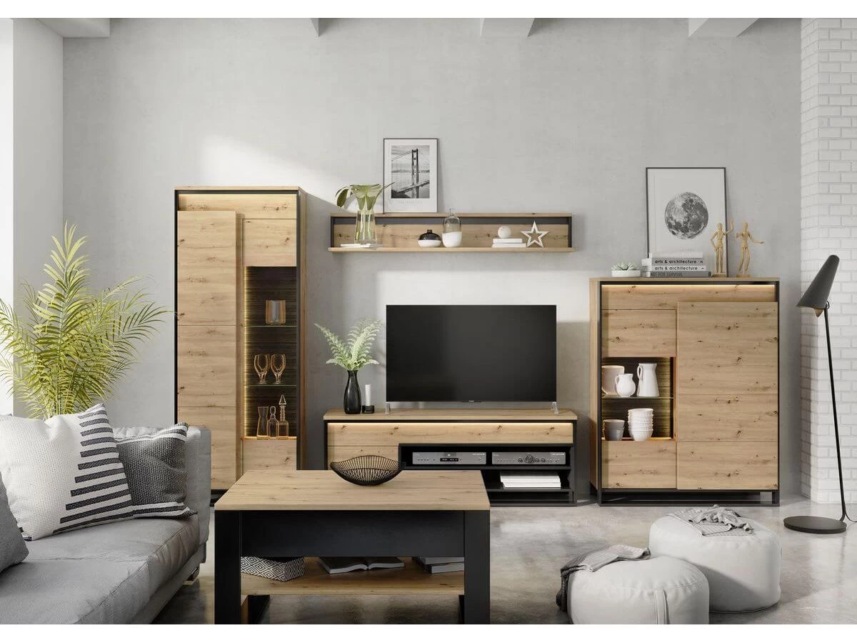 Succombez au charme de la collection KYRIA au style industriel ! Les pieds noirs géométriques confèrent aux meubles un caractère loft, qui séduira tous les amateurs d’élégance moderne. Spacieuse, caractérisée par des façades claires et des cadres noirs élégants, cette collection ne deviendra jamais l’arrière-plan, mais sera l’acteur principal de votre salon. Les façades sont équipées d’un éclairage extérieur à leds, qui souligne la couleur bois claire. L’éclairage interne des vitrines, disponible en option supplémentaire, permet d’exposer vos objets décoratifs.
